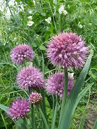 Покрывало (чехол) коротко заострённый, равный зонтику. Зонтик шаровидный, реже полушаровидный, густой, многоцветковый, цветоножки равные или до 2 раз длиннее околоцветника. Листочки яйцевидно-колокольчатого околоцветника розовые, с малозаметной жилкой, 5—8 мм длины, тупые. Нити тычинок в 1,5—2 раза длиннее листочков околоцветника, столбик сильно выдается из околоцветника. Коробочка почти в полтора раза короче околоцветника.