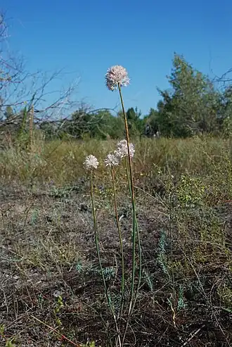 Геофит. Многолетнее травянистое растение 30-60 см высотой. Луковицы по 1-3 на очень коротком корневище, удлиненно-яйцевидные, с бурыми сетчато-волокнистыми полупрозрачными оболочками. Стебель до трети высоты обернут листьями. Листьев 3-4, линейно-нитевидные, плоские. Соцветие многоцветковое, зонтиковидное, густое, шарообразное. Цветки беловатые с розовым оттенком, листочки околоцветника 1,5 мм длиной. Нити тычинок более чем в 1,5 раза длиннее околоцветника, пыльники желтые.