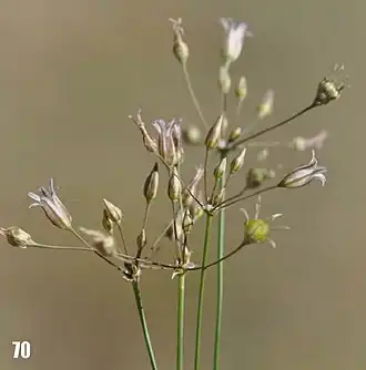 Чехол заострённый, мелкий, в несколько раз короче зонтика, остающийся. Зонтик пучковатый, малоцветковый, рыхлый. Листочки колокольчатого околоцветника розовые, с более тёмной жилкой, длиной 6—7 мм, почти равные, линейно-ланцетные, туповатые. Нити тычинок в полтора раза короче листочков околоцветника, почти до половины между собой и с околоцветником сросшиеся, цельные, шиловидные, почти равные. Столбик не выдается из околоцветника.