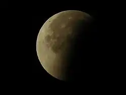 ![]() На изображении показаны почасовые положения Луны в период времени, близкий к затмению (Луна двигается с запада на восток, то есть справа налево). В 16 градусах к востоку от Луны в ночь затмения при помощи оптических инструментов можно было наблюдать Уран (зв. вел. 5,7). Жёлтая линия — эклиптика. В центре снимка обозначены земная тень и полутень | |