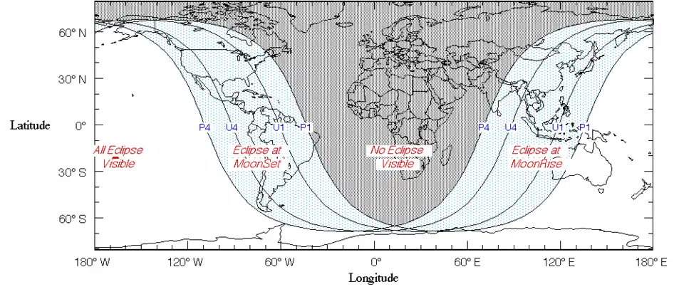 По прилагаемой ниже схеме видно, что полной картиной затмения могут полюбоваться лишь жители восточной части Австралии, Тихого океана и западной части Аляски. Жители дальнего востока смогут пронаблюдать затмение на восходе Луны. А затмение на закате смогут увидеть жители Северной и Южной Америки.