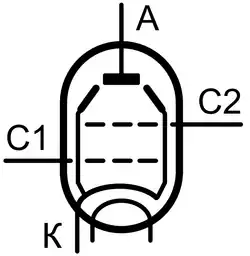 Условное графическое изображение лучевого тетрода. А — анод, К — катод, С1 — управляющая (первая) сетка, С2 — экранирующая (вторая сетка)