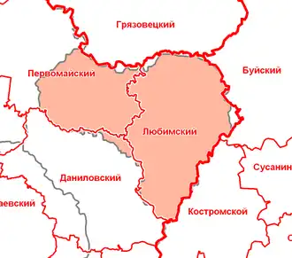 Любимский уезд (до 1740-х гг. — Любимская осада)[1] входил в состав Костромской провинции, с 1777 года — в составе Ярославского наместничества, с 1796 года — в составе Ярославской губернии.