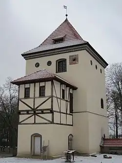 Главная юго-западная башня, т.н. Надвратная, в плане кубическая (примерно 10×10 м), примерно на половине высоты переходит в восьмерик, завершённый ренессансным куполом с фонарём.