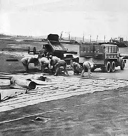 Взлетно-посадочная полоса имела длину 1696 м[7] и была укреплена перфорированными стальными листами.