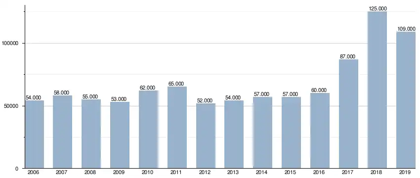 | 2022[57] | 266,000 ▲ | 108,000 ▼ |