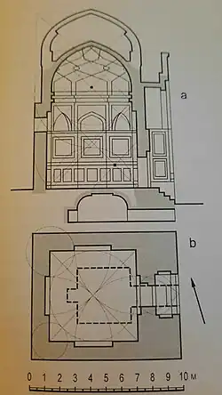 Мавзолей представляет традиционный для ансамбля Шахи-Зинда портально-купольный тип.