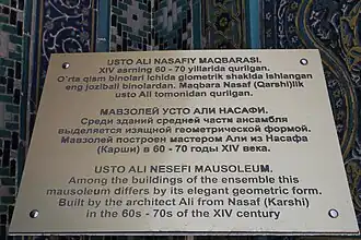 - ↑ Бабаджанов Б., Рустамов У. Эпиграфика комплекса Шахи-Зинда (тексты, переводы). Самарканд 2015.
