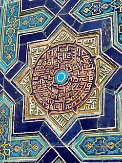 В остальные восьмиконечные картуши портала (в нижних частях пилонов, по углам и в центре тимпана) вписаны круги, в которых также имеются тексты (Коран, 2:255). Буквы золоченные, с красной окантовкой. Фон темно-синий. Почерк — весьма стилизованный геометрический куфи. По краям этой надписи внутри лучей восьмигранника таким же стилизованным почерком куфи написаны сакральные сентенции (Во имя Аллаха, будет то, что пожелает Аллах…)