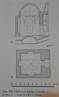 Мавзолей Ходжи Ахмада представляет собой типичный для XIV века однокамерный портально-купольный тип здания с главным порталом во всю ширину передней стены, который был тиражирован в ансамбле в последующие десятилетия. Квадратный внутренний план здания с нишами по сторонам показывает, что мавзолей был перекрыт когда-то куполом, основанном на восьмигранном арочном парусе.