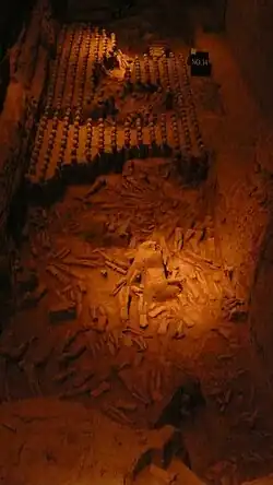 Раскопки вокруг «пирамиды» показали, что к ней ведут 86 узких тоннелей, содержащих богатый клад фигурок, символизирующих жертвоприношения (см. ниже). Некоторые из них имеют выстланный пол и деревянные подпорки, в длину составляют от 4 до 100 м. Также имеются пять захоронений на северо-востоке, которые выстроены в колонну с севера на юг. Средняя ширина погребений 3-4 м. Глубина самой большой из них составляет 100 м, в то время как средняя глубина — 4м[5].