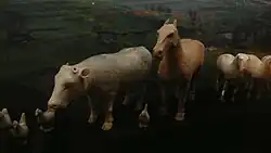 Наличие подобных фигурок в качестве погребального инвентаря немаловажно, согласно принятой в Китае типологии домашних животных и птиц, они сводятся к пяти существам: корова/бык (ню), баран (ян), кура/петух, собака (гоу) и свинья (чжу). Это типология возникла из ритуально-этикетного уложения, в котором мясо перечисленных животных существ служило календарной пищей, а сами они соотносились все с теми же пятью пространственными зонами — соответственно с Центром, Востоком, Югом, Западом и Севером. То есть данная типология является отражением общекультурных реалий Древнего Китая[10]. Что касается барана, можно лишь предположить, что помимо его функций как мясного домашнего животного и жертвенного животного баран ассоциировался с Мужским началом, с солнцем и с идеей как внешней красоты, так и внутреннего совершенства человека[11]. Наличие фигурок собак, неслучайно, поскольку они мыслились как животные, связанные с миром мертвых и способные охранять своего усопшего хозяина и его пристанище от злых сил либо служить его проводником в загробном царстве. Охранительные функции собаки, конечно же, сближают её образ с образом Белого тигра, так что в этом случае соотнесение собаки с Западом оказывается полностью оправданным[12]. Площадь территории, на которой находится погребение № 11, составляет 24м2 . В ней были найдены глиняные фигурки воинов, выстроенные в 4 колонны. Данные фигурки обращены лицом к восточным воротам мавзолея и спиной — к императорской усыпальнице. Между каждыми двумя колоннами воинов располагались деревянные телеги. Найденные предметы погребения были представлены в виде 26 керамических фигурок воинов, 17 деревянных окрашенных фигурок лошадей,4 деревянных телег, оружие из бронзы и железа и снаряжения для лошадей и телег, которых насчитывалось несколько сотен[13]. Что касается погребения № 19, была исследована лишь небольшая территория, площадь которой составляет 12м2. Были обнаружены 4 деревянные фигуры лошадей, 1 деревянная телега, 20 необычных фигур воинов, 10 керамических фигурок животных, оружие из бронзы и железа, снаряжения для лошадей и телег, а также керамическая посуда на общую сумму около 30 штук. Данные артефакты были расположены следующим образом: фигуры деревянных лошадей — на переднем фланге, за ними следовали деревянные телеги, по обе стороны от них — фигуры воинов, выстроенные в линию, а также позади, тоже по обе стороны на заднем фланге были глиняные фигурки животных и керамическая посуда.[14]