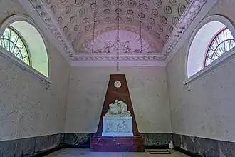 У стены против входа располагается мраморный кенотаф на высоком пьедестале, украшенном рельефом с изображением скорбящего семейства Павла I. На пьедестале коленопреклоненная плакальщица в короне — олицетворение Марии Фёдоровны (без портретного сходства[2]). Монумент находится на фоне гранитной пирамиды, украшенном мраморным медальоном с портретом Павла I. Памятник выполнен Иваном Мартосом в 1809 году[1]. Помещение украшено скудно, чтобы всё внимание было обращено к кенотафу. Стены облицованы белым мрамором, панели тёмно-серые, понизу идёт узкий черномраморный плинт. Поверху у стен слегка выступает фриз, сильно вынесен карниз с модульонами. Перекрытие — сводчатое цилиндрическое, с шестигранными кессонами с двумя видами розетт. На трёх цепях из центра свисал бронзовый светильник, выполненный в форме удлинённой амфоры с позолоченными масками. На торцевых стенах — люнеты с лепными композициями: Гений Славы над дверями со скрижалями Истории и два плачущих амура на стене у кенотафа[2].