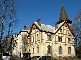 Здание построено на участке, отданном Гвардейскому экономическому обществу в аренду на 36 лет[1], в 1911—1912 годах по проектам А. И. фон Гогена и В. И. Шёне (также указывается участие военного инженера К. Д. Грибоедова, выполнившего инженерные расчёты конструкций[1]). В оформлении использован декоративный фахверк, контраст кирпича-кабанчика и штукатурки. У главного фасада несимметричные боковые звенья и разные щипцы. Здание венчает остроконечная шатровая башня[2]. Так как на участке есть значительный перепад рельефа, со стороны парка у здания сделан высокий полуподвал. С северной стороны здания — широкое крыльцо-терраса[1].