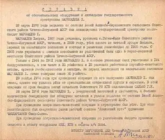 - ↑ Справка об обстоятельствах обнаружения и ликвидации государственного преступника Магомадова Х.