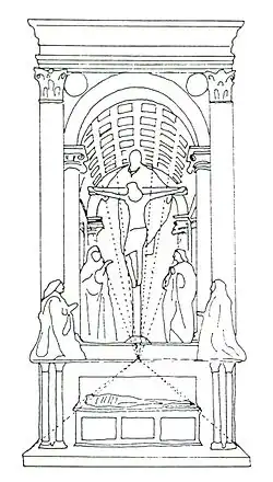 В связи с тем, что в этом произведении с особой последовательностью воплощены законы перспективы и архитектурные принципы Брунеллески, критики неоднократно писали, что оно было создано под непосредственным руководством этого архитектора, однако большинство не разделяет эту точку зрения. В отличие от традиционного изображения распятия на фоне синего неба с плачущими ангелами и толпой у подножья, Мазаччо расположил крест в архитектурном интерьере, похожем на свод древнеримской триумфальной арки. Вся сцена очень напоминает архитектурную нишу, в которой стоят скульптуры. Технология производства композиции, вероятно, была проста: Мазаччо вбил гвоздь в нижней части фрески, от которого натянул нити, и прочертил по ним поверхность сланцевым карандашом (его следы просматриваются и сегодня). Таким образом была выстроена линейная перспектива.