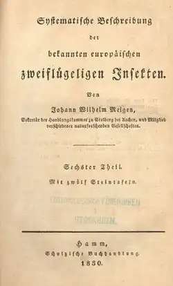 - Meigen, J. W., 1804, Klassifikazion und Beschreibung der europäischen zweiflügeligen Insekten Part 1 , in English, Systematic description of the known European two-winged insects. Reichard, Braunschweig [= Brunswick] (5 November)