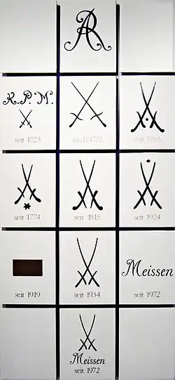Скрещённые мечи стали символом мануфактуры с 1731 года, когда весь фарфор из Майсена должен был иметь клеймо. Изображение мечей превалировало над клеймом «AR» («Augustus Rex») и «посохом Меркурия». Для выявления товаров не идеального качества на мечи надглазурно наносили поперечные штрихи. Первые маркировки такого типа можно найти на изделиях примерно с 1764 года.