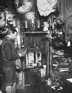 В зимовочной хижине общее помещение было разгорожено упаковочными ящиками на крохотные закуты; Маккей делил свой с коком Уильямом Робертсом, который в Лондоне служил поваром в «Военно-морском клубе»[7]. Шеклтон описывал их обиталище в юмористическом духе: