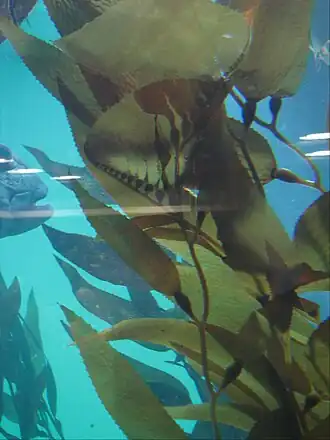 Макроцистис (лат. Macrocystis) — род бурых водорослей из семейства ламинариевых. Включает самые крупные из известных водорослей, превышающие длину 45 метров[2]. Отдельные экземпляры живут до 8—10 лет, хотя обычно жизнь водоросли короче. Используются в аквакультуре. Широко распространены у морских берегов субтропической, умеренной и субантарктической зон Южного полушария, а также вдоль северо-восточного побережья Тихого океана от штата Южная Калифорния (Мексика), до города Ситка на Аляске (США). Растут на скалистых и каменистых грунтах на глубине 20—30 м.[3]