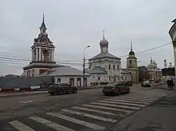 Улица Варварка. Слева направо: колокольня Знаменского монастыря, церковь Максима Исповедника, храм Великомученицы Варвары. Максимовский переулок начинался между церковью Максима Исповедника и колокольней Знаменского монастыря