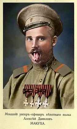21 марта 1915 года австрийцами взят наш редут на Юго–Западном фронте. Штыковым ударом 1 роты 148–го Каспийского полка редут взят обратно. При этом был отбит телеграфист Каспийского полка Алексей Макуха, которому австрийцы вырезали язык за отказ дать сведения о наших войсках. Верховный Главнокомандующий, ознакомившись с фактом зверства в отношении рядового Алексея Макухи, повелел: