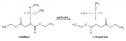 Однако, по данным из последних источников, в определённых условиях малатион может подвергаться изомеризации (МеО-Р=S → МеS-P=O) с образованием дитиофосфата, у которого токсичность в отношении теплокровных значительно выше, чем у малатиона[10].