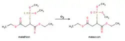 Под влиянием окислителей малатион превращается в соответствующий Р=О—аналог (малаоксон), физиологическая активность которого выше. Этот процесс происходит в организме насекомого, он в меньшей степени свойствен растениям и теплокровным. Этим обусловлена высокая токсичность малатиона для вредителей — в организме насекомых малатион превращается в более токсичный малаоксон, а процессы гидролиза препарата протекают значительно медленнее, чем у теплокровных.[7]