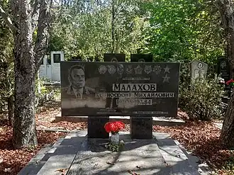 Генерал-лейтенант танковых войск Ксенофонт Михайлович Малахов в декабре 1960 года вышел в запас. Умер 9 августа 1984 года в Симферополе. Похоронен на кладбище Абдал-1, сектор 14.