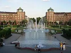 В 1607 году Маннгейм стал городом, и в последующие годы был отстроен исторический центр города в форме подковы, с дворцом и перпендикулярными друг к другу улицами, делящими центр на квадраты и прямоугольники. Отсюда произошло название центра: «квадраты». «Прозвище» Мангейма — «Quadratestadt» (город квадратов). Начиная от замка и до реки Неккар простирается исторический центр города — так называемые «квадраты» — прямоугольные блоки зданий, разделённые улицами, перпендикулярными и параллельными стенам замка. Квадраты носят названия, состоящие из буквы и числа (например, «A1» или «M7»), которые распределены относительно замка и главной улицы города, проходящей от фасада замка до моста через Неккар. Эта улица носит название Kurpfalzstrasse, но горожанами именуется исключительно как Широкая улица (нем. Breite Strasse[8]). Она находится наполовину в пешеходной зоне, в которой расположены многочисленные магазины и административные здания.