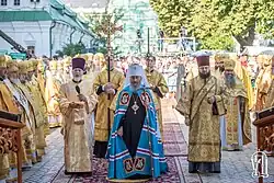 Мантии у архиереев (епископы, архиепископы, митрополиты, патриархи) такие же, как у архимандритов, но с более длинным шлейфом и как правило пурпурного цвета. Кроме этого на мантию архиерея нашиваются в три ряда белые и красные (в иных случаях золотые) ленты из другой ткани — так называемые «источники», или «струи». Они символически изображают учение, истекающее из Ветхого и Нового Заветов, проповедовать которое — обязанность епископа. Шлейф у мантии довольно длинный и поэтому его, как правило, носят за архиереем его иподиаконы.