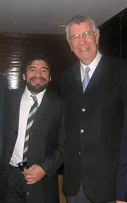 Дие́го Арма́ндо Марадо́на (исп. Diego Armando Maradona, испанское произношение: [ˈdjeɣo maɾaˈðona]; 30 октября 1960, Ланус — 25 ноября 2020, Дике-Лухан) — аргентинский футболист, игравший на позициях атакующего полузащитника и нападающего. Выступал за клубы «Архентинос Хуниорс», «Бока Хуниорс», «Барселона», «Наполи», «Севилья» и «Ньюэллс Олд Бойз», а также сборную Аргентины. Чемпион мира 1986 года, вице-чемпион мира 1990 года. Чемпион мира среди молодёжных команд 1979 года. Лучший игрок чемпионата мира 1986 года. Футболист года в Южной Америке 1979 и 1980 годов. Дважды член символических сборных чемпионатов мира[2]. Чемпион Аргентины в составе клуба «Бока Хуниорс». Двукратный чемпион Италии в составе клуба «Наполи».