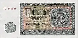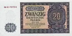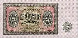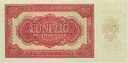 После Второй мировой войны побеждённая союзниками Германия была разделена на четыре зоны оккупации: американскую, британскую, французскую и советскую. В западных зонах 20 июня 1948 года в одностороннем порядке была введена Немецкая марка (ФРГ) (нем. Deutsche Mark). В качестве ответной реакции 24 июня 1948 года в советской зоне была учреждена своя денежная единица. Немецкая марка (нем. Deutsche Mark) советской зоны (позже ГДР) в 1974 году была переименована в марку ГДР (нем. Mark der DDR) и просуществовала до 1990 года[2].
