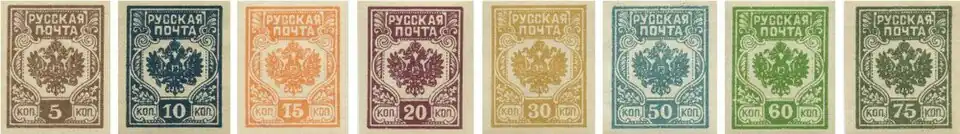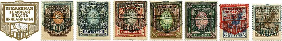 В сентябре или октябре 1919 года[9] Омским правительством адмирала А. В. Колчака была произведена эмиссия из шести марок с зубцами и четырёх — без зубцов (Mi #1A—4B; Yt #1—10) на марках Российской империи 17-го и 21-го выпусков с надпечаткой нового номинала. Надпечатки производились в Экспедиции заготовления государственных бумаг Омского правительства в Омске.