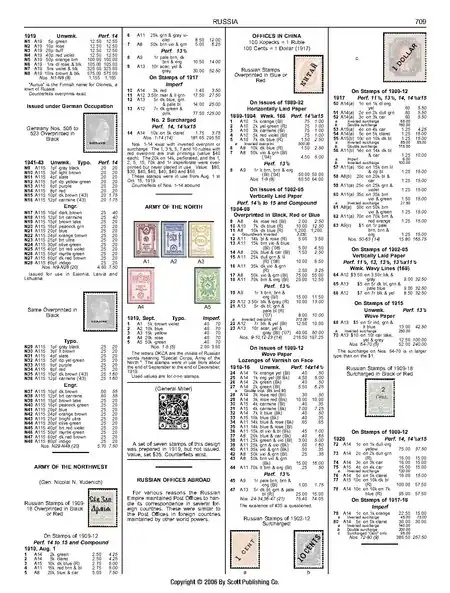 | Страница каталога «Скотт» (том 5, секция марок России), показывающая в числе других выпуски периода Гражданской войны |