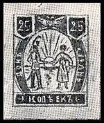 Второй выпуск, осуществлённый в 1919 году, представлял собой типографскую надпечатку на почтовых марках России 17-го и 21-го выпусков и сберегательных марках чёрной краской в одну строку цифры стоимости и буквы «к» или в две строки цифры стоимости и слова «рубля» («рублей»). Третий — 1920 года, представлял собой типографскую надпечатку чёрной краской в две строки цифры стоимости и слова «коп.» («рублей») на марках России 17-го и 21-го выпусков[6].