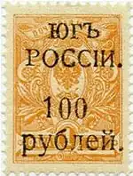 - Бэйли В. Л. Г. Крымская надпечатка «ЮГЪ РОССИИ — 100 рублей» на 1 коп. // Россика. — 1959. — № 57. — С. 32-34.