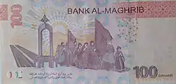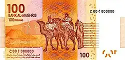 100 дирхамов 145×70 коричневый портрет Мухаммеда VI Сахарская палатка; ветротурбинная ферма; три верблюда с всадниками по пустыне портрет Мухаммеда VI;