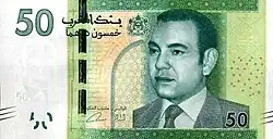 50 дирхамов 147×70 зелёный портрет Мухаммеда VI глинобитное здание портрет Мухаммеда VI;