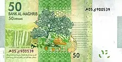 50 дирхамов 138×70 зелёный портрет Мухаммеда VI Водопад Узуд; аргановое дерево, фрукты и птица портрет Мухаммеда VI;
