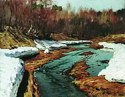 - ↑ К числу художников, находившихся под сильным впечатлением от левитановского «Марта», также причисляли пейзажиста Станислава Жуковского. В частности, похожий мотив был использован им в представленной на 27-й передвижной выставке картине «Пригрело» (1899), которую критиковали за «явное подражание» «Марту»[78].