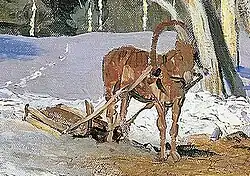 Иногда в качестве предвестника картины «Март» упоминают написанный в 1894 году пейзаж русского художника-импрессиониста Константина Коровина «Зимой» (ныне в ГТГ), где также изображена лошадка с санями, стоящая у деревенского дома. Однако, в отличие от солнечно-весеннего полотна Левитана, на картине Коровина изображён хмурый зимний день[35][36].