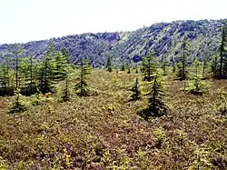 - Сфагнуво-багульниковые мари . Кочки на таких болотах менее высокие, а травяной фон на много беднее, состоит из осоки Майера, пушицы, кровохлёбки, калужницы, повсеместно присутствует мох сфагнум. Значительно развиты кустарнички: голубика, багульник. Кустарники мельче и беднее составом. Главный полог образует берёза Минддендорфа и стелющаяся чёрная ива. В комплексе эти две породы носят название ёрника.
