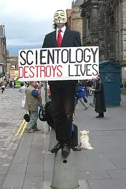 - 1 2 3 4 John S. Forrester (11 февраля 2008), Dozens of masked protesters blast Scientology church. Web-based foes guard IDs, assert risk of retribution, The Boston Globe, Архивировано из оригинала 3 марта 2016, Дата обращения: 18 мая 2012
