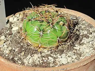 Кактус сплющенно-шаровидной формы, высотой 10 и диаметром до 12 см. Корень стержневой. Колючки закрученные, янтарного цвета. Цветки жёлтые или золотистые, длиной 5 см и 3—4 см диаметром; раскрыты круглые сутки. Цветёт весной и летом. Размножается семенами. В естественной среде обитания растёт медленно, но значительно быстрее в условиях неволи[4].