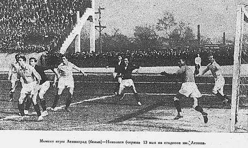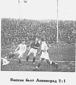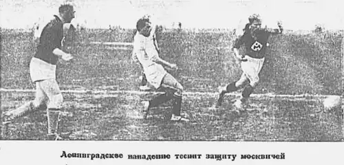 - ↑ Согласно подробному отчёту «ФиС», которому следуют и все питерские источники, "... Григорьев получает мяч и (...) передает в центр. Здесь мяч принимает Бутусов и корпусом проводит его из образовавшейся толкучки в ворота". Поскольку гол забит из зоны центрфорварда, некоторые московские источники в своих отчетах указали гол, как «формально» забитый "из центра", "центр-форвардом" и даже называли центрального нападающего Г.Архангельского как автора гола («Правда»).