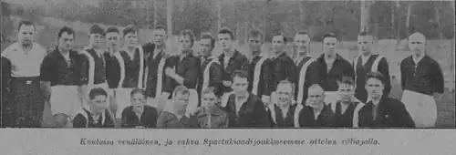 - ↑ Состав этой сборной команды организации финских рабочих клубов TUL (Työväen Urheiluliiton jalkapallojoukkue) был сформирован для участия во Всесоюзной спартакиаде и включал всех сильнейших футболистов. Несмотря на последовавший позднее от TUL запрет на участие в спартакиаде, команда все равно отправилась в Москву и выступила в соревнованиях. За это игроки команды были исключены из TUL, после чего перешли в «буржуазный» чемпионат и стали выступать за национальную сборную. Целый ряд игроков этого состава весьма значим в финском футболе тех лет — Рейно Фри, Эрнст Грёнлунд (37 матчей за национальную сборную), Вильо Хальме (30 матчей), Франс Карягин (57 матчей), Еро Ронканен (4), Лаури Синикари-Практиг (5) и другие.