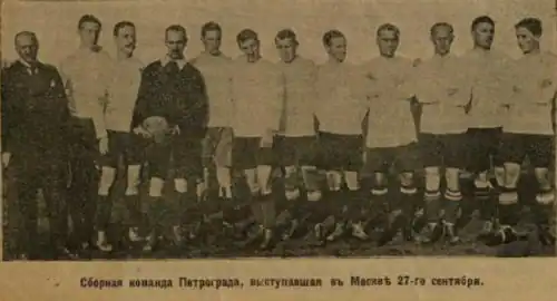 - ↑ Во многих источниках на этом месте расположен Н.Гостев II, указанный в первоначальном анонсе состава на матч; однако «Вечернее время», приводя состав петроградцев, определённо поясняет: "... и Лагунов («Петровский»), который заменил не приехавшего без предупреждения Гостева, поставившего было петроградскую команду в затруднительное положение".