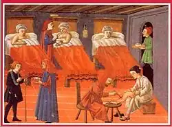 Берестяные грамоты начала XIV в. сообщают о наличии монастырских больниц в древнем Новгороде. В первой половине XVI в. основана больница при Соловецком монастыре. При ней была специальная больничная библиотека. Монахи занимались не только практической медициной, перепиской и хранением рукописей, но и переводом греческих и латинских книг медицинского содержания. Так в начале XV в. в Кирилло-Белозерском монастыре, на территории которого располагались больничные палаты, его основатель монах Кирилл Белозерский (1337—1427) перевёл с греческого небольшой рукописный трактат «Галиново на Иппократа» — комментарии Галена на сочинение одного из врачей школы Гиппократа, получивший затем широкое распространение[16], а в XVII век монах Чудова монастыря Епифаний Славинецкий перевёл на русский язык сокращенный труд Андреаса Везалия по научной анатомии «Эпитоме»[17]. При этом они дополняли их своими знаниями, основанными на опыте русского народного врачевания[16].