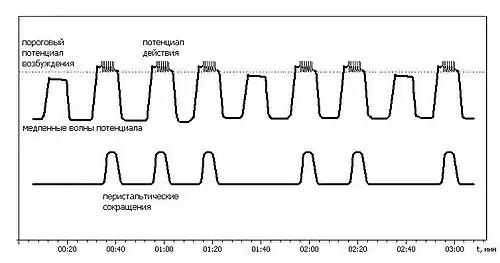 Медленные волны не вызывают сокращения мышц. Сокращение гладкомышечной ткани возникает только при появлении на плато медленных волн быстрых электрических колебаний — потенциалов действия (другое название потенциалов действия — спайки). Медленные волны создают в мышцах потенциал, близкий к порогу активации, что даёт возможность возникновению потенциалов действия с последующим сокращением мышечного волокна. При высокой деполяризации клеточной мембраны потенциалы действия могут инициироваться медленной волной, при низкой деполяризации потенциалы действия затухают. Потенциал действия вызывает сокращение стенки органа и повышает внутрипросветное давление в органе. Сокращения могут быть сегментарными (нераспространяющимися) и пропульсивными (распространяющимися).